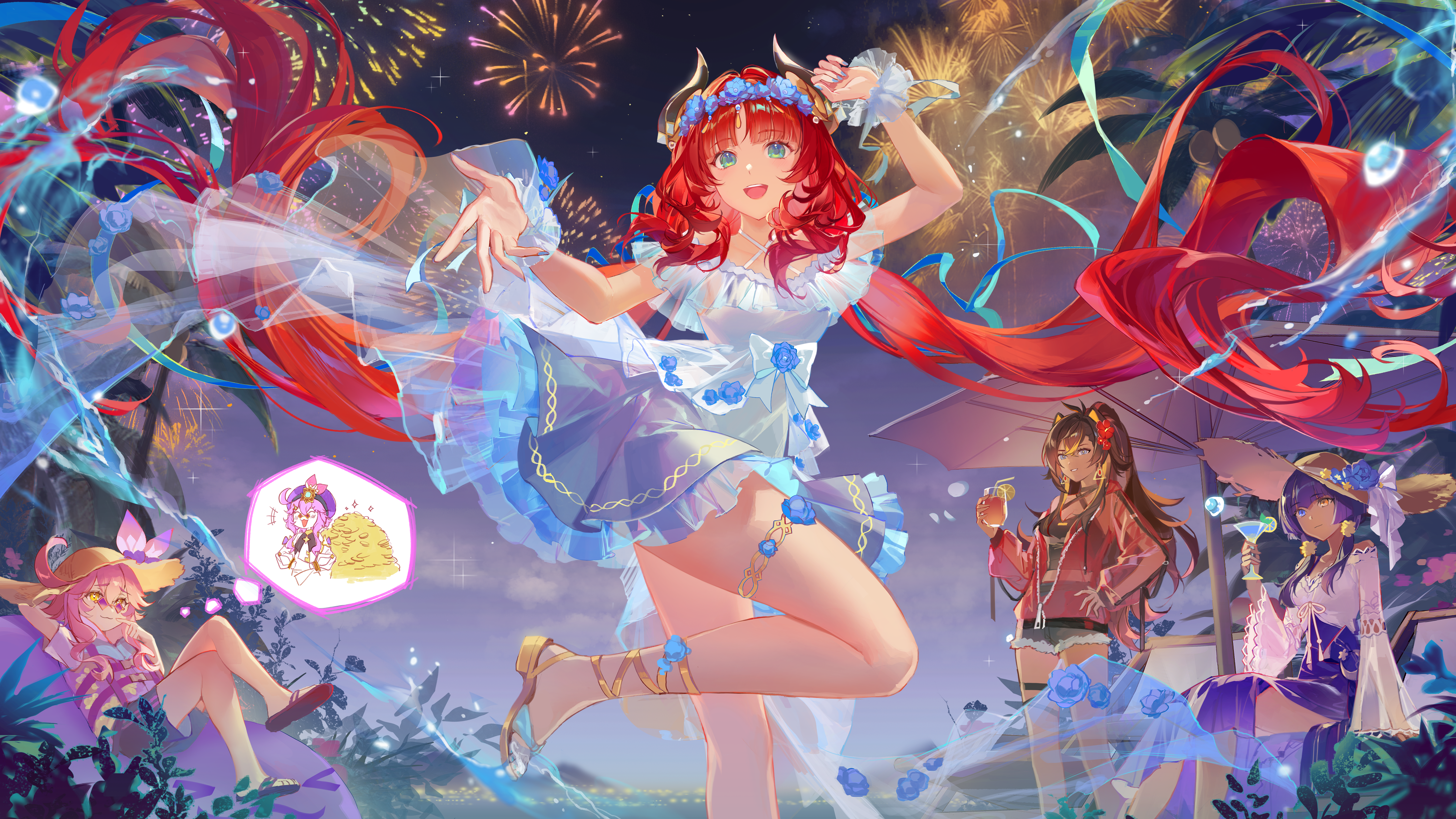 - Home > Anime Wallpaper >Free download Smiling Long Hair Red Hair Blue Eyes Pink Hair Hat Woman Purple Hair Anime Girl Sun Hat Yellow Eyes Flowers Fireworks Night Sky Leaves Blue Nails Drinks 4K Wallpaper