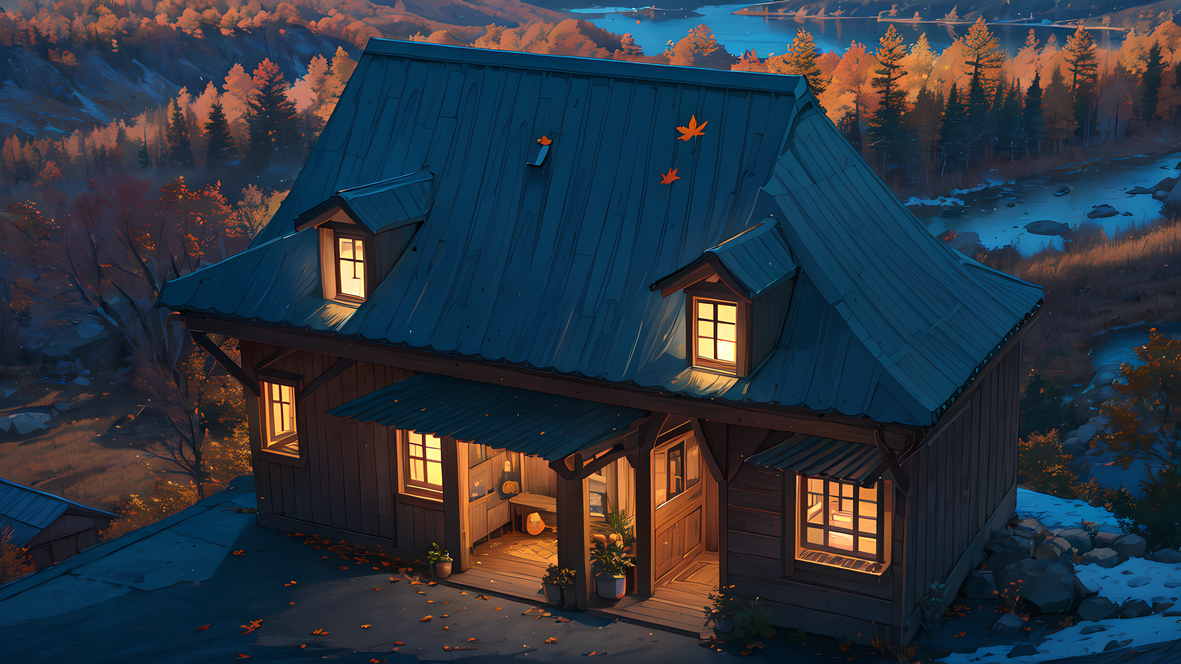 Art Maple Leaf House Night Leaves Water Tree 4K Wallpaper