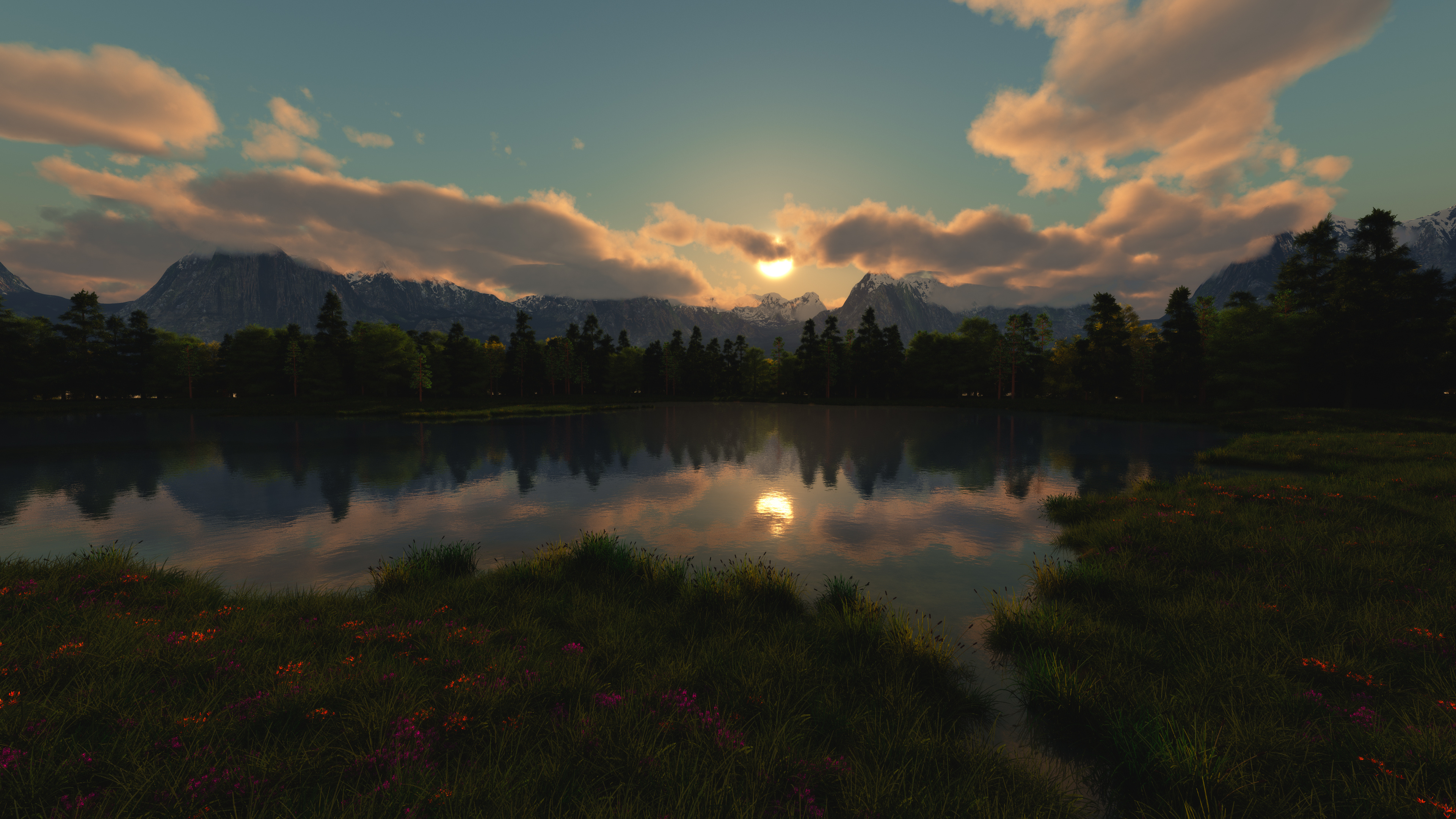 Landscape Nature Lake Clouds Sun Reflection Tree Mountain Grass AI Art 4K Wallpaper
