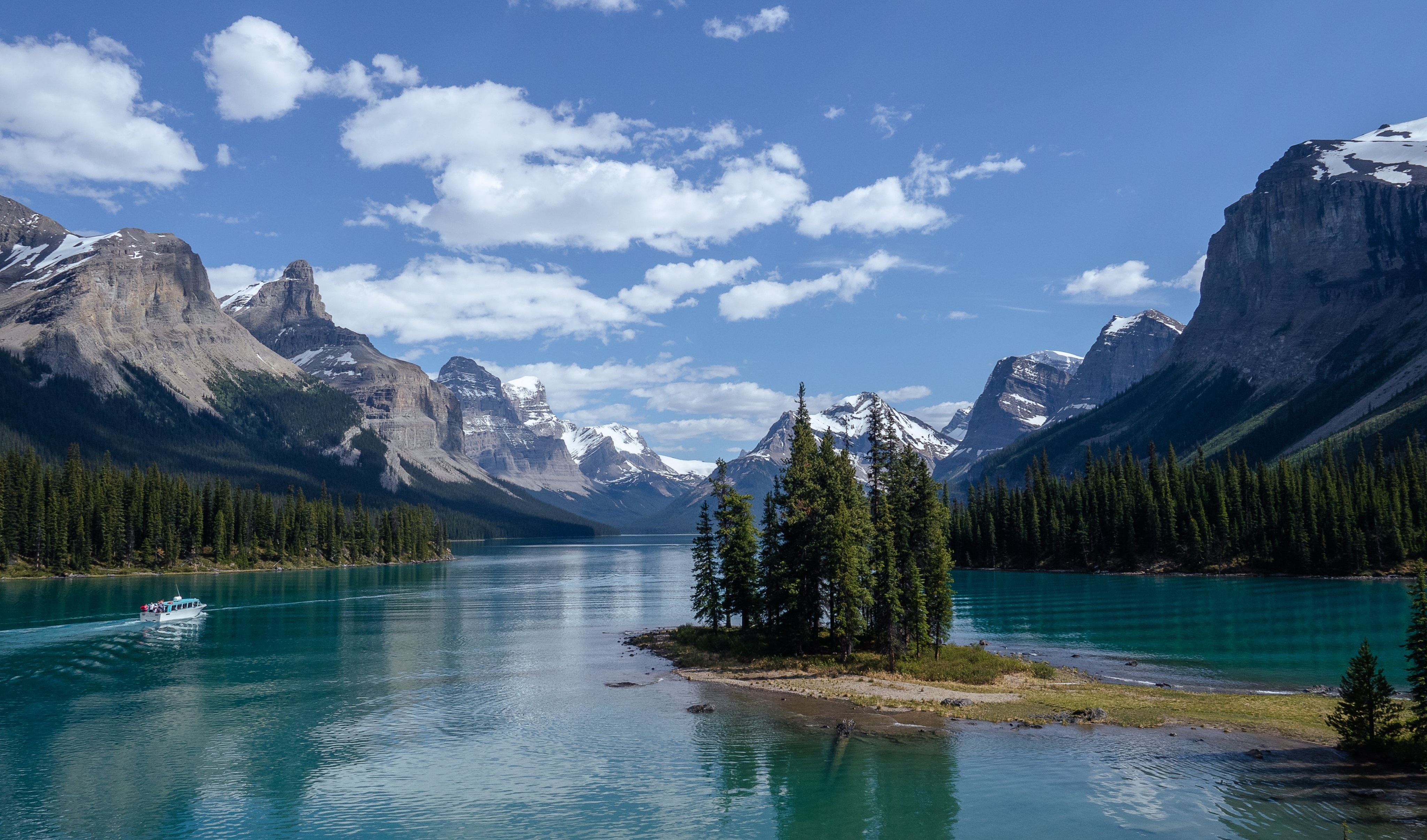 Landscape Nature Mountains Snow Mountains Pine Forest Island Lake Cloud Boat Park Computer Wallpaper 4K Wallpaper