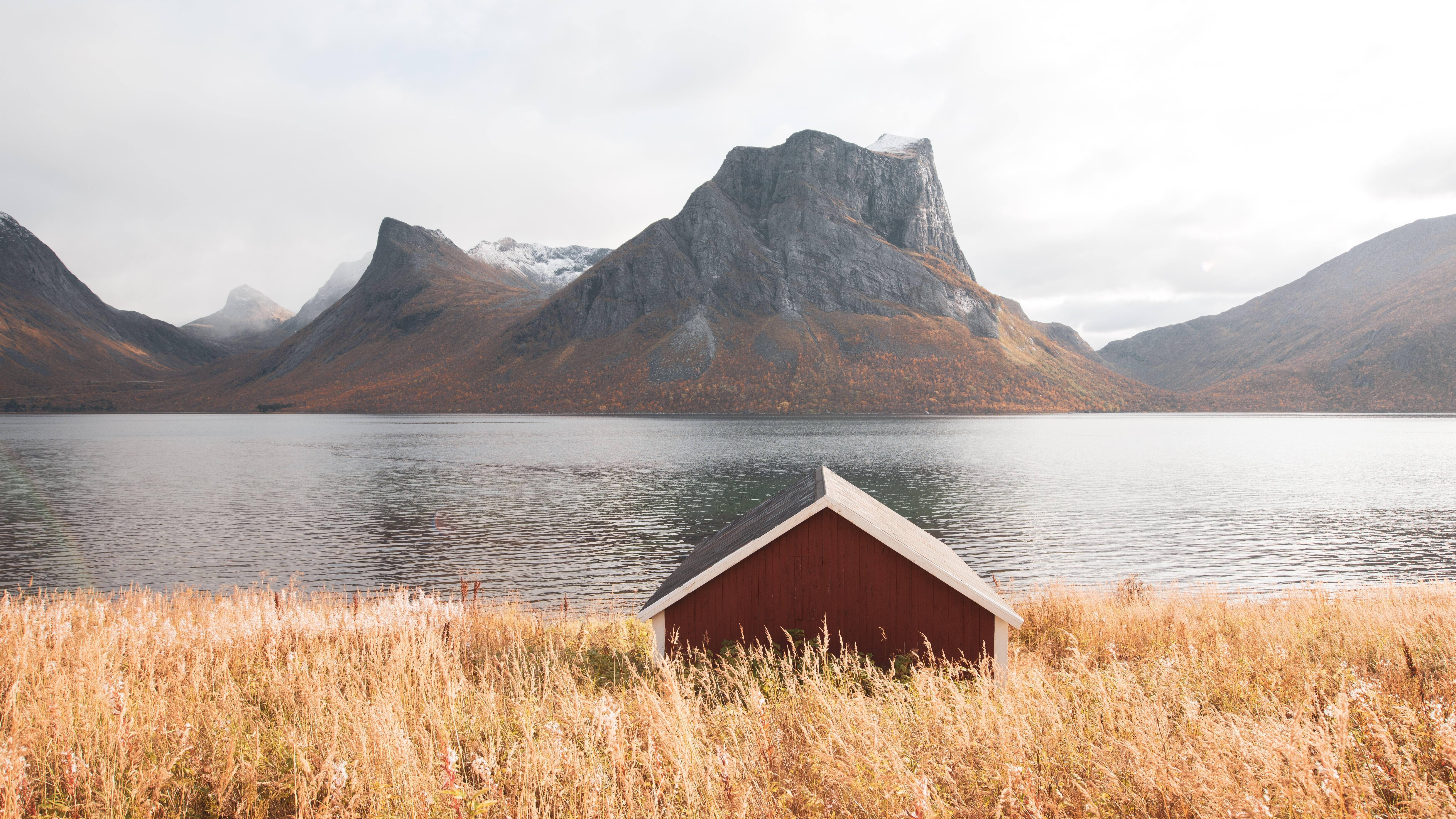 Landscape Norway Nature Mountains Water Log Cabin 4K Wallpaper