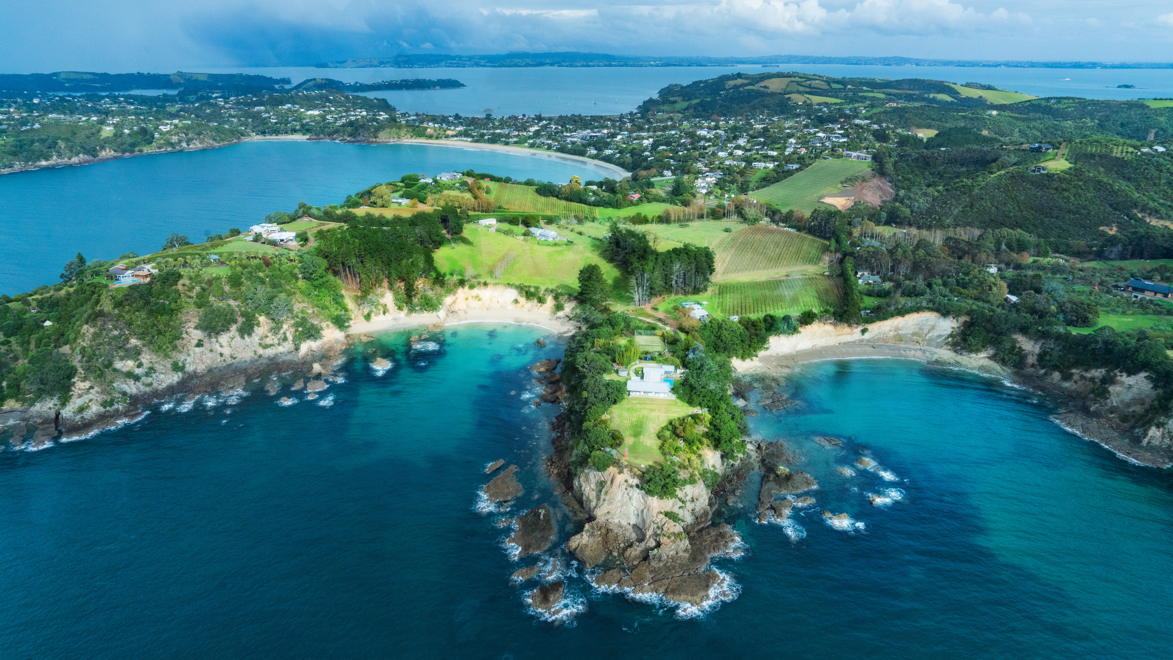 - Landscape Peninsula Rock Field Trees Water City Horizon Nature 4K Wallpaper