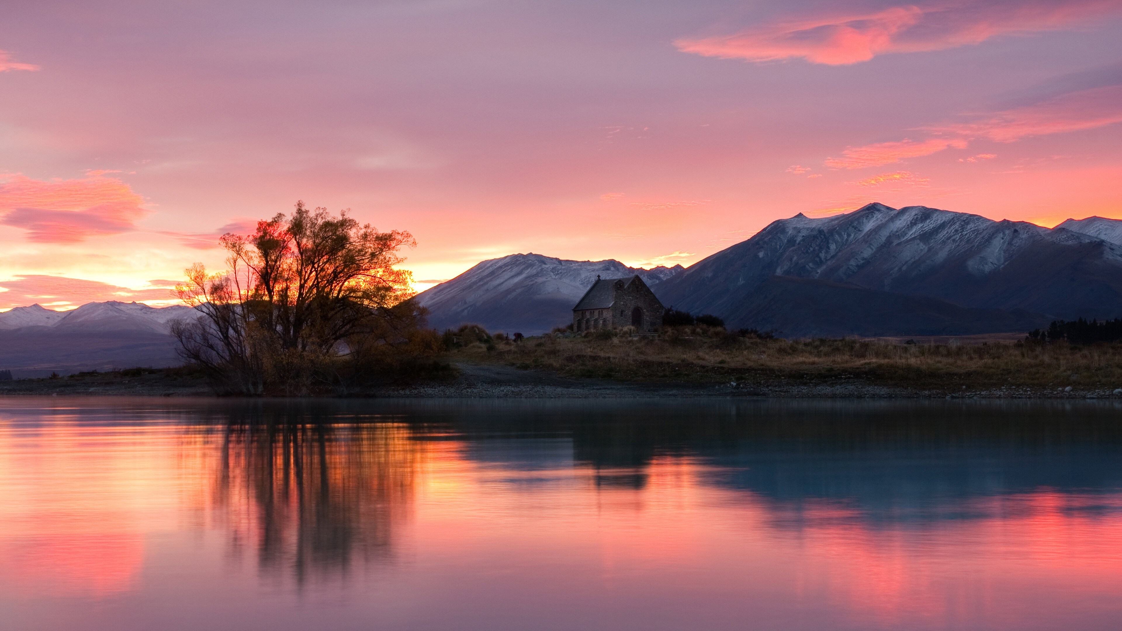 • Landscape Sunrise Lake Mountains Snow Mountain River Nature Computer Wallpaper 4K Wallpaper