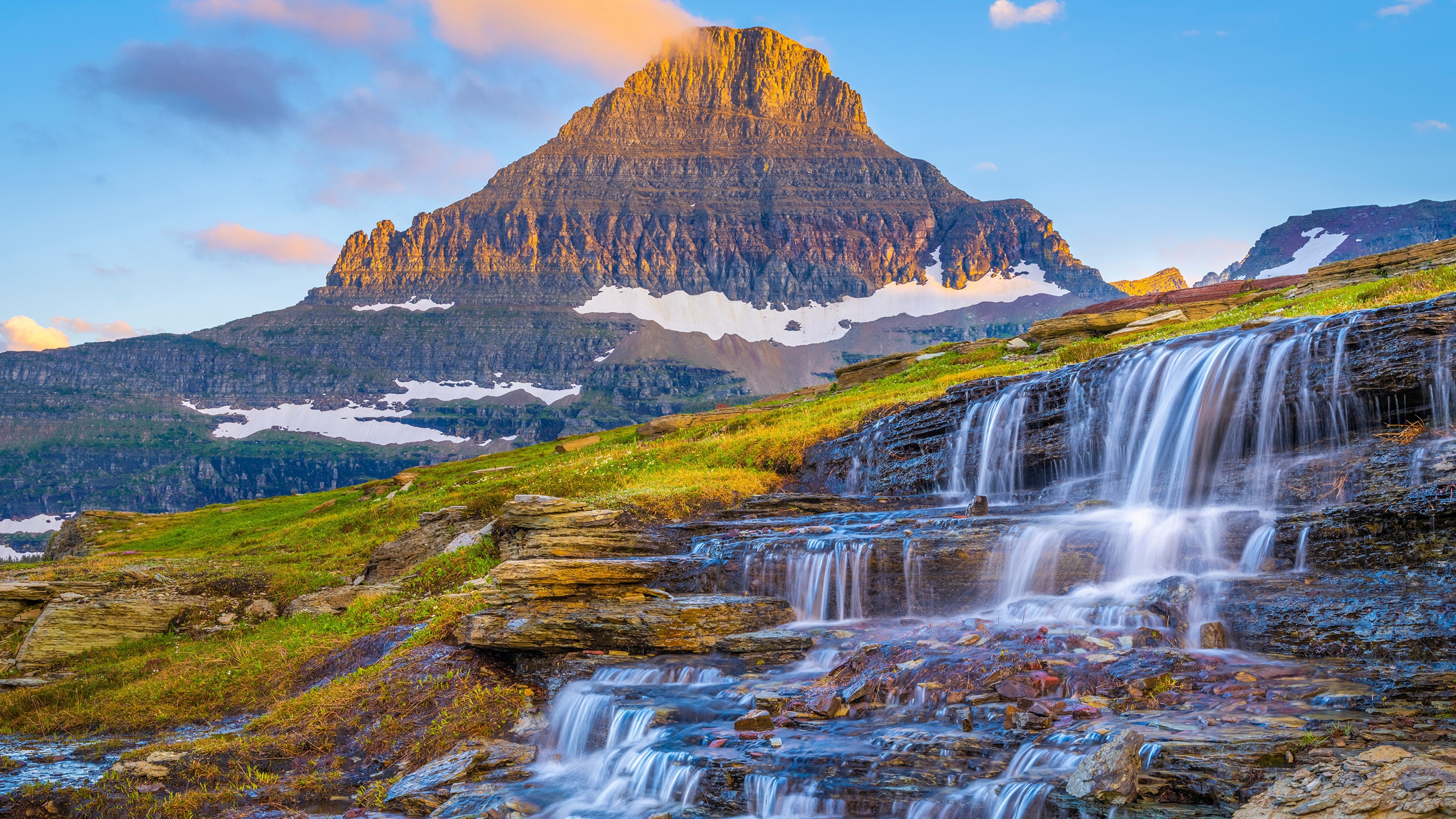 - Nature Landscape Mountains Sky Waterfall Rocks Snow Sunset Glow Water Cloud Computer Wallpaper 4K Wallpaper