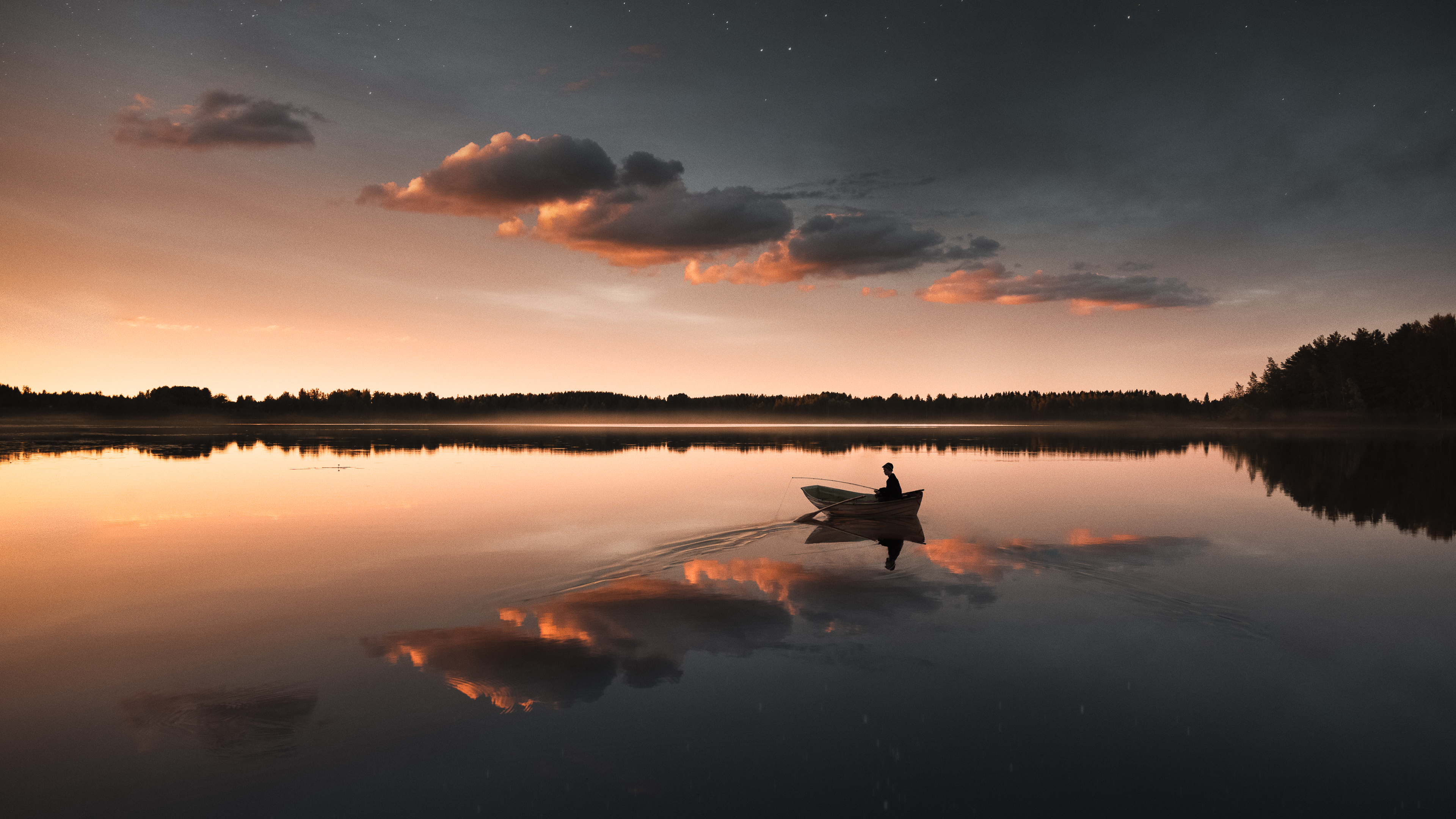 Nature Landscape Photography Sunset Cloud Reflection Lake Boat Fishing Fish Stars 4K Wallpaper