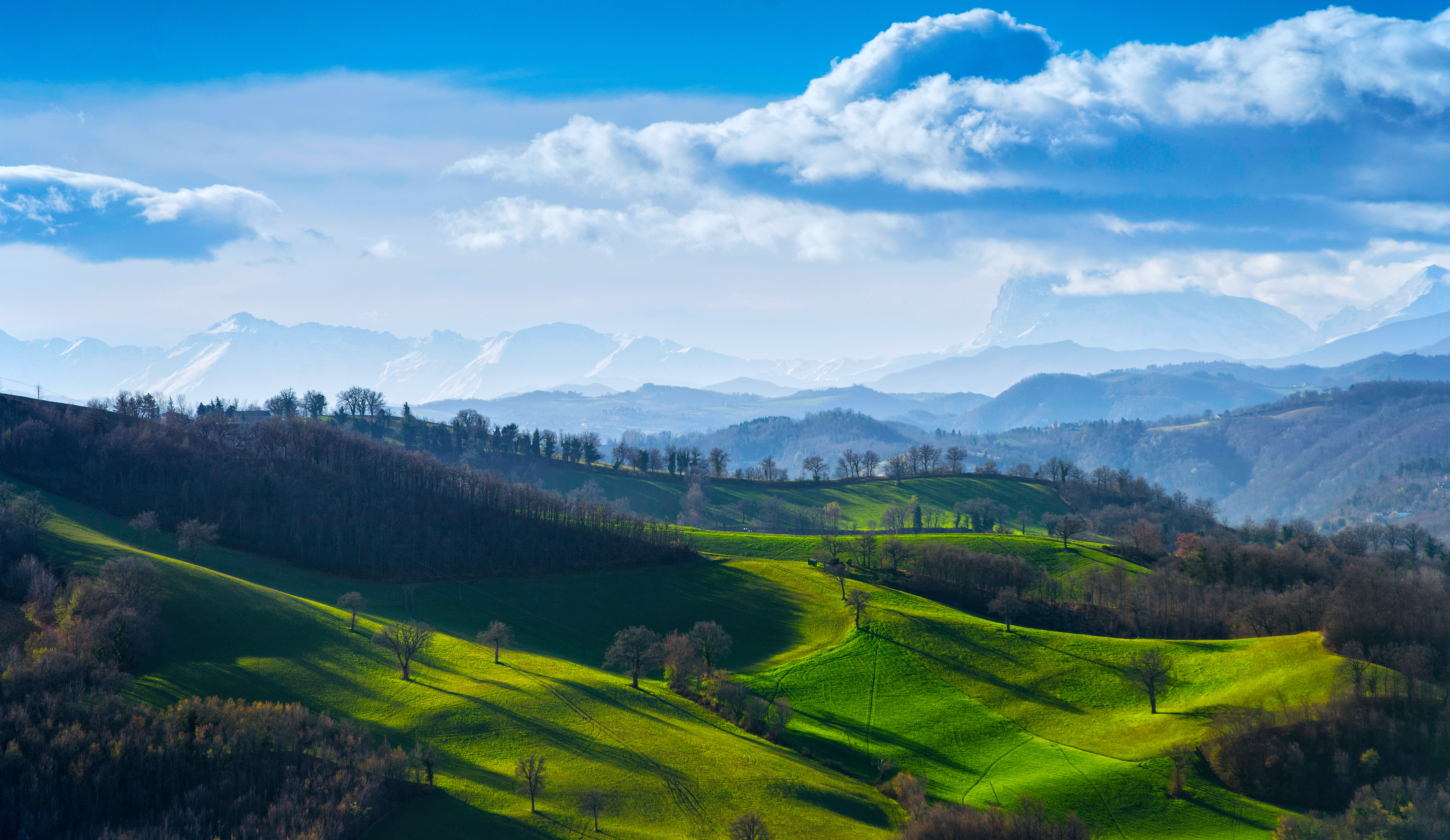 • Nature Landscape Sky Cloud Grass Field Hill Trees Sunshine Vista Sunrise Forest Green 4K Wallpaper