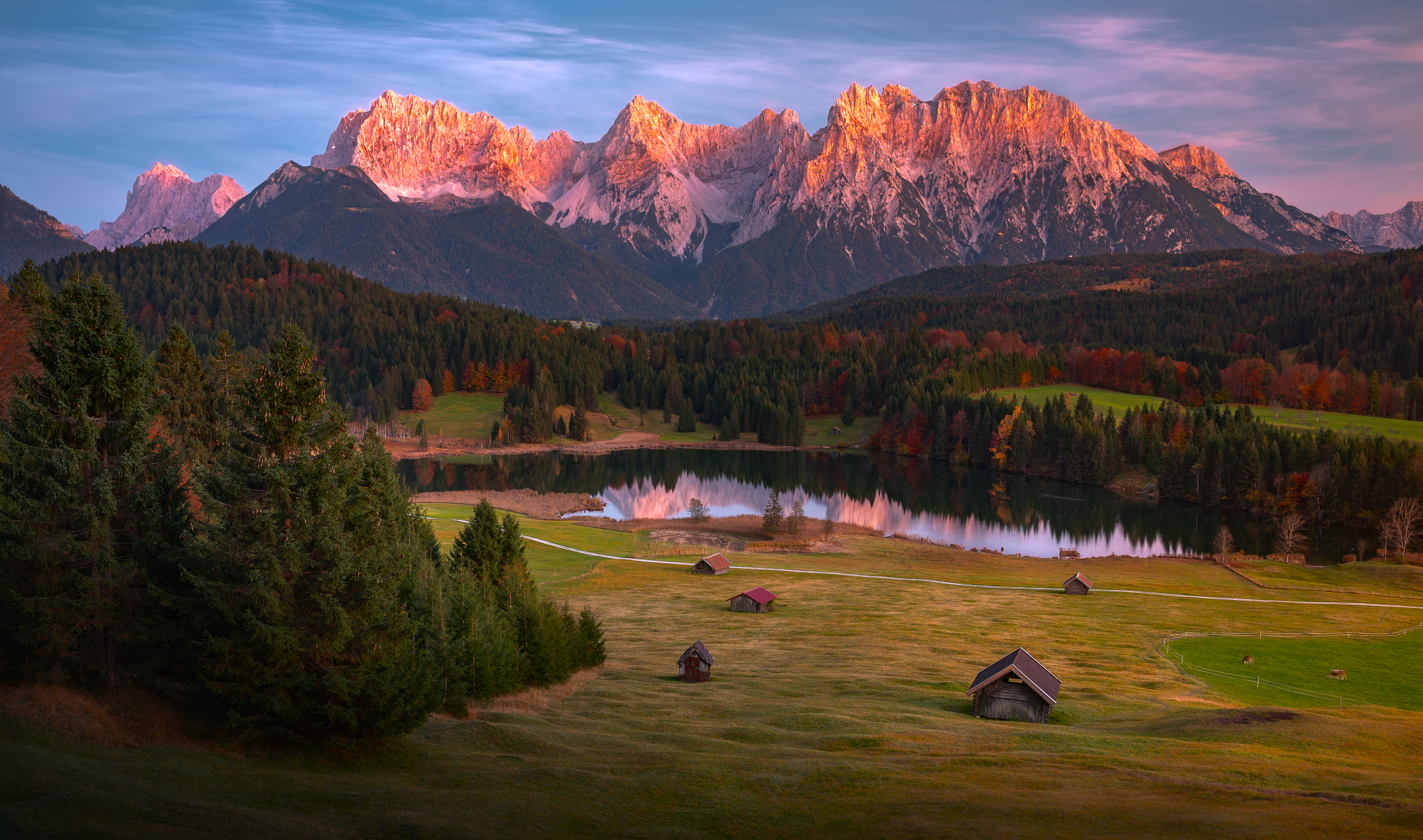 - Nature Landscape Sky Cloud Mountains Trees Grass Field Houses Hut Lake Snow Mountains Pines Autumn 4K Wallpaper