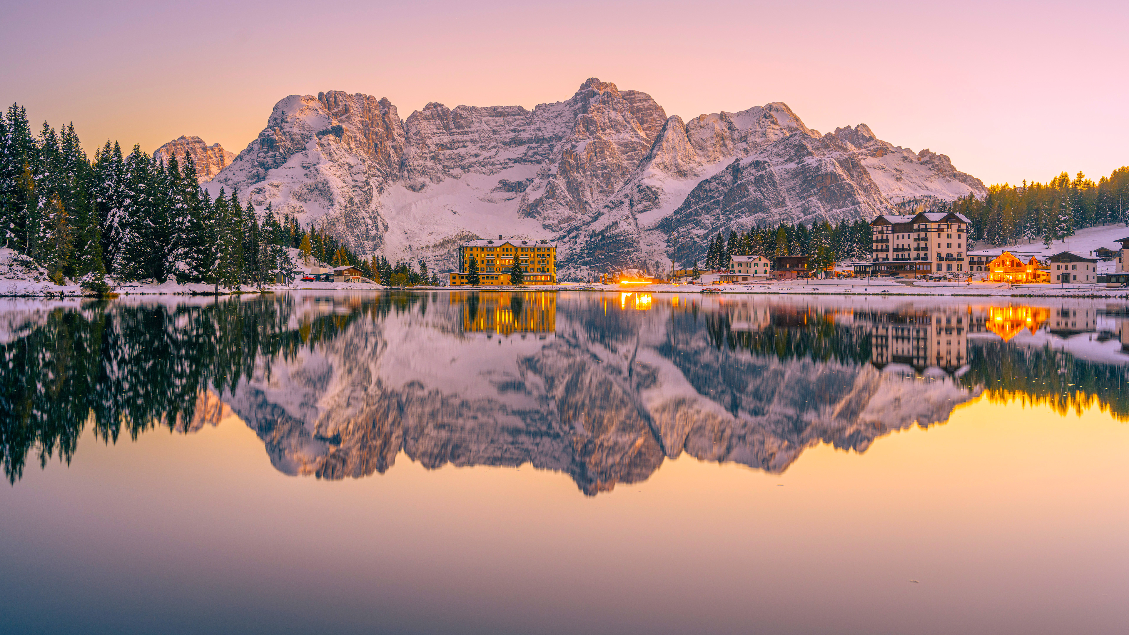 -  Home > Landscape Wallpaper >Free download Nature Landscape Trees Snow Mountains Water Lake Reflection Lights Sky 4K Wallpaper