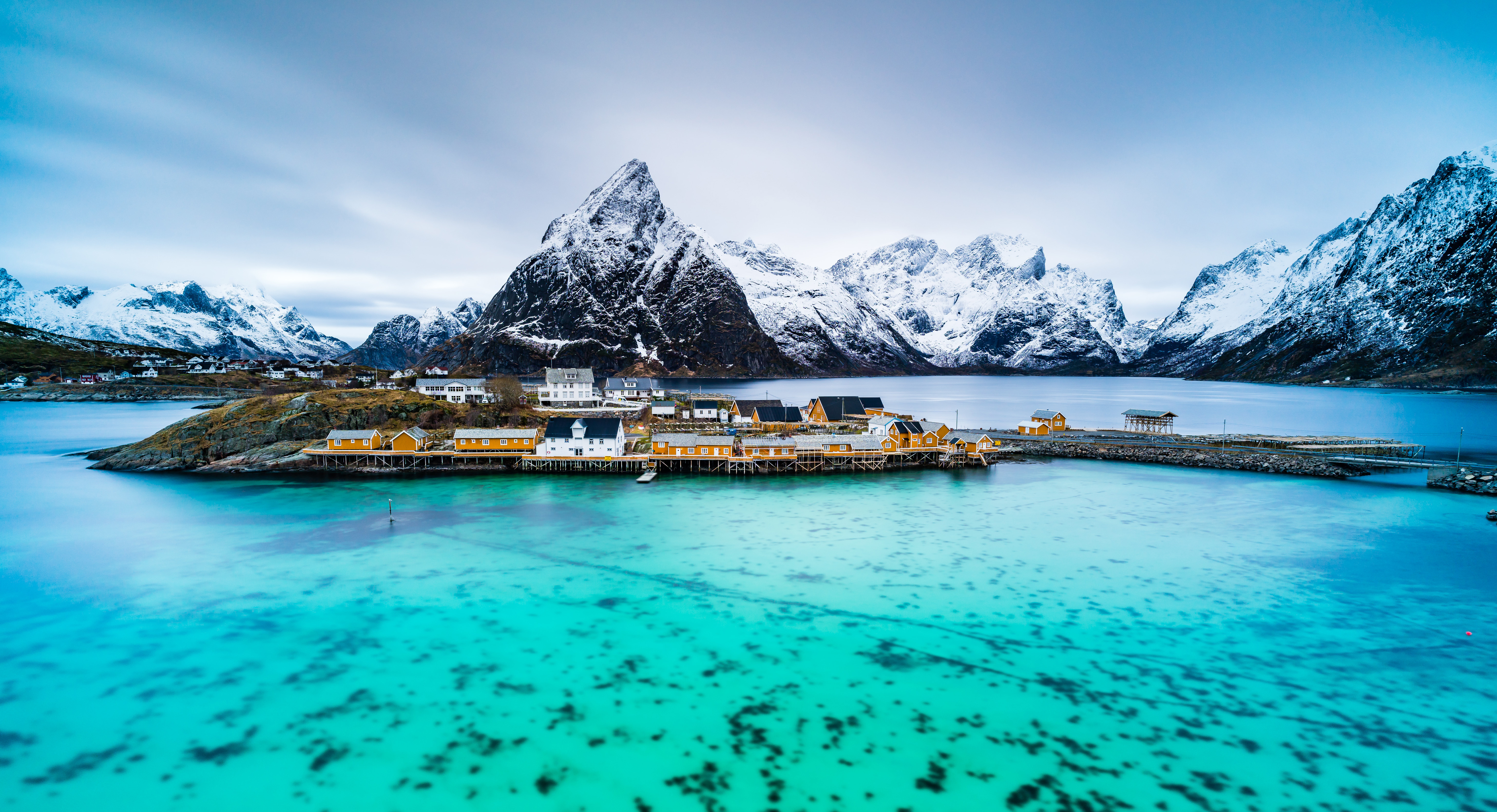 Nature Landscape Village Houses Mountains Sky Rocks Snow Mountains Winter Water Islands Seaside 4K Wallpaper