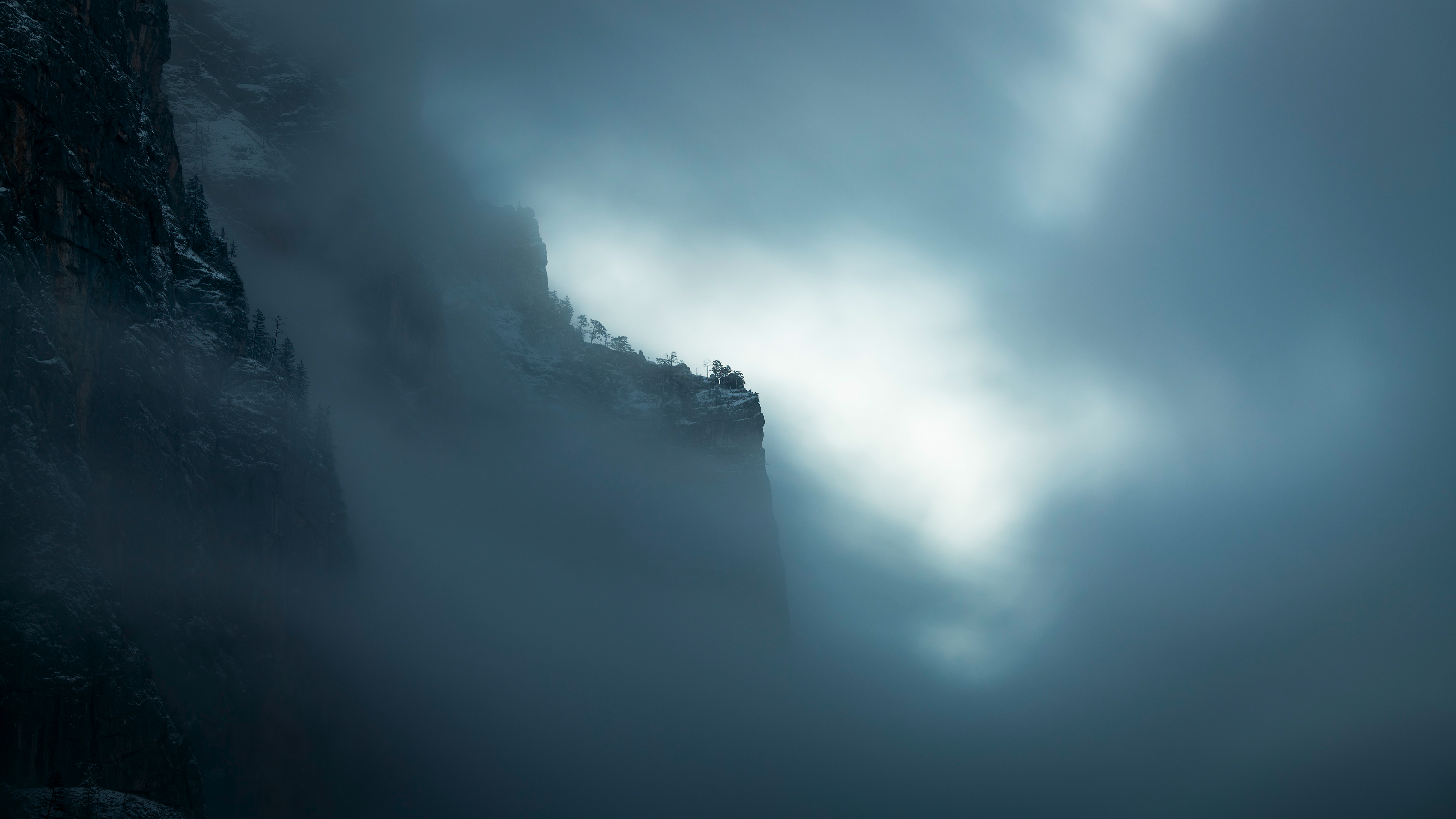 Nature Mountains Trees Rocks Dark Misty 4K Wallpaper