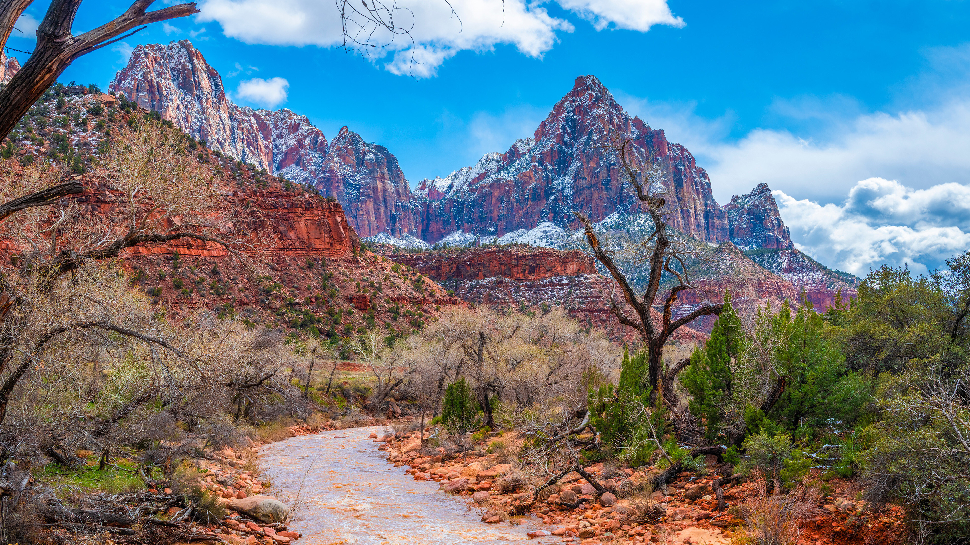Nature Park Trees River Mountains Sky Landscape Clouds Snow Computer Wallpaper 4K Wallpaper