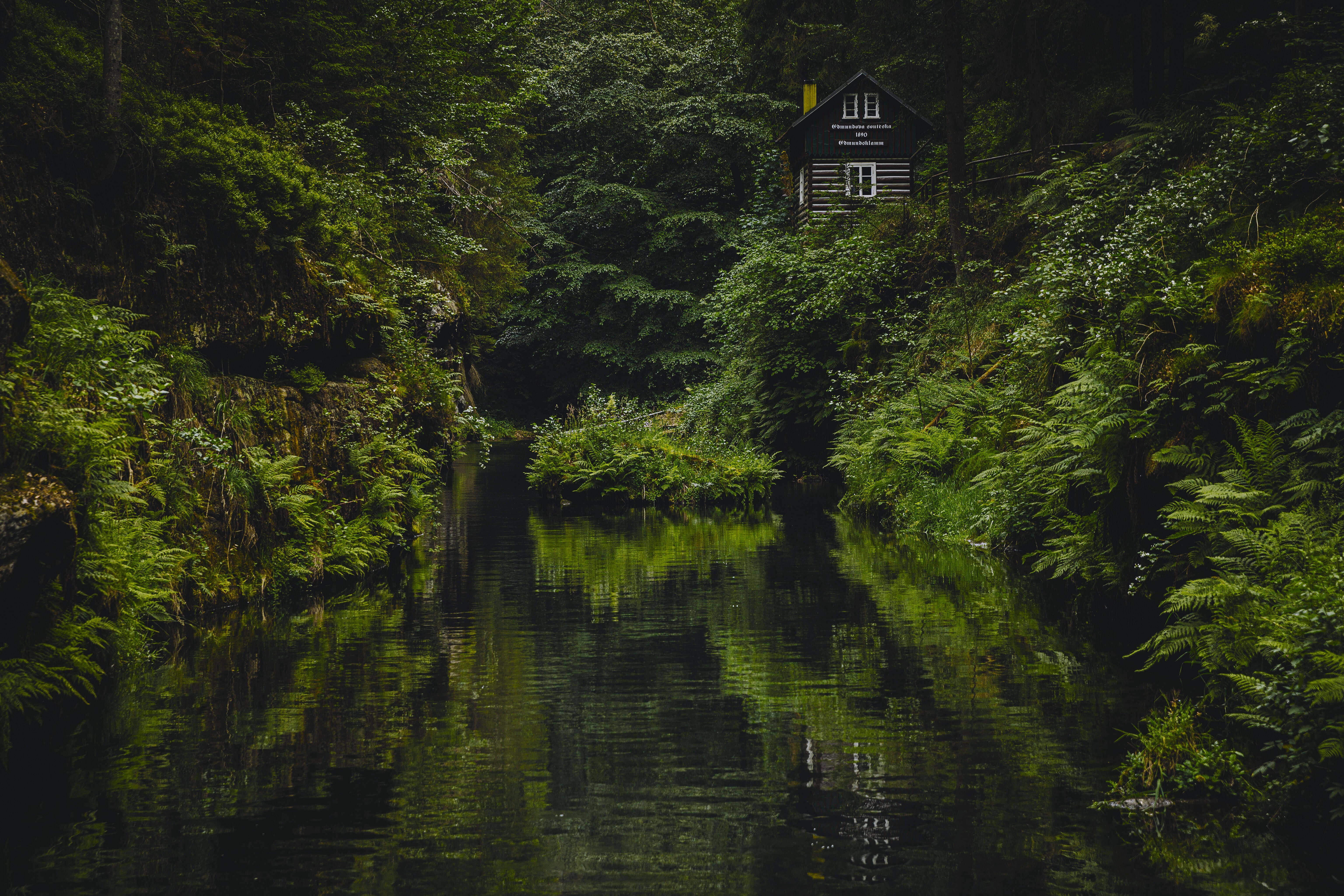 Nature Trees Plants Water Grass Moss Rainforest Hut River 4K Wallpaper