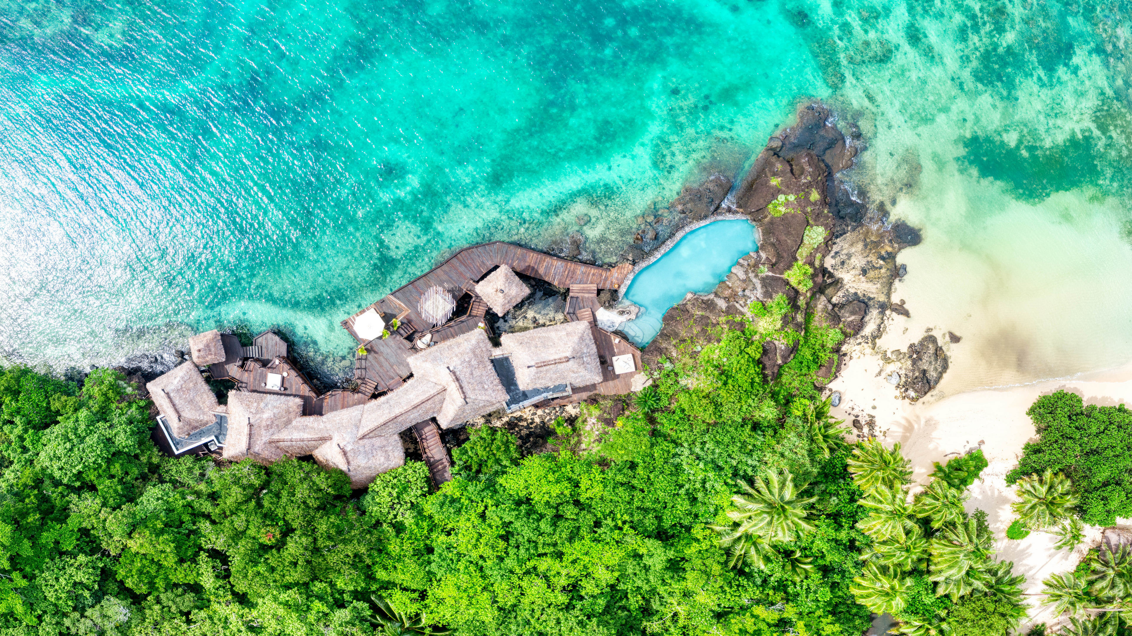 Photography Landscape Aerial View Water Beach Nature Trees Bungalow Resort Sand Rocks Swimming Pool Forest Computer Wallpaper 4K Wallpaper