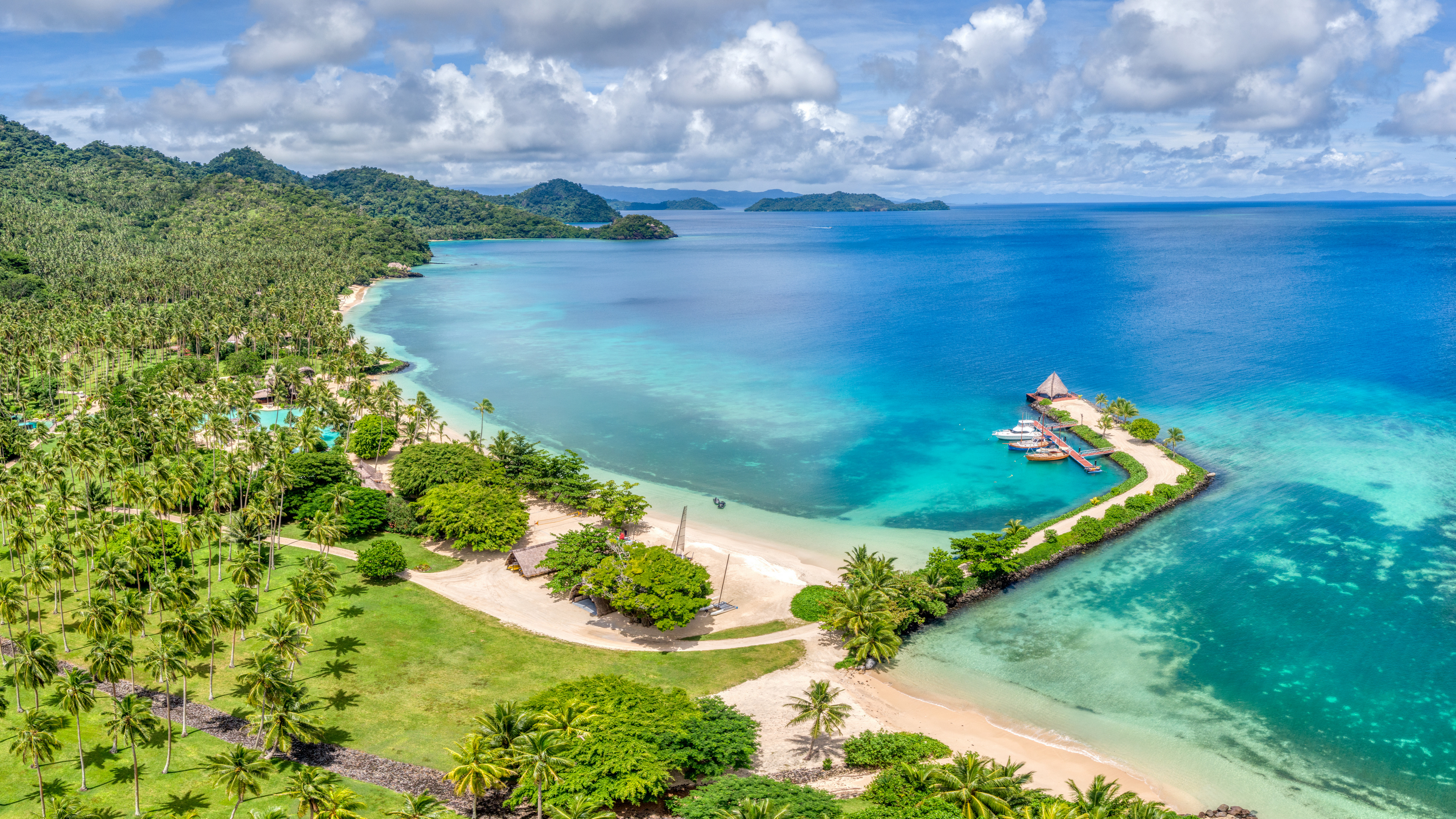 Photography landscape bay beach resort water nature forest palm trees hill dock sky cloud bungalow boat grass sand island 4K wallpaper