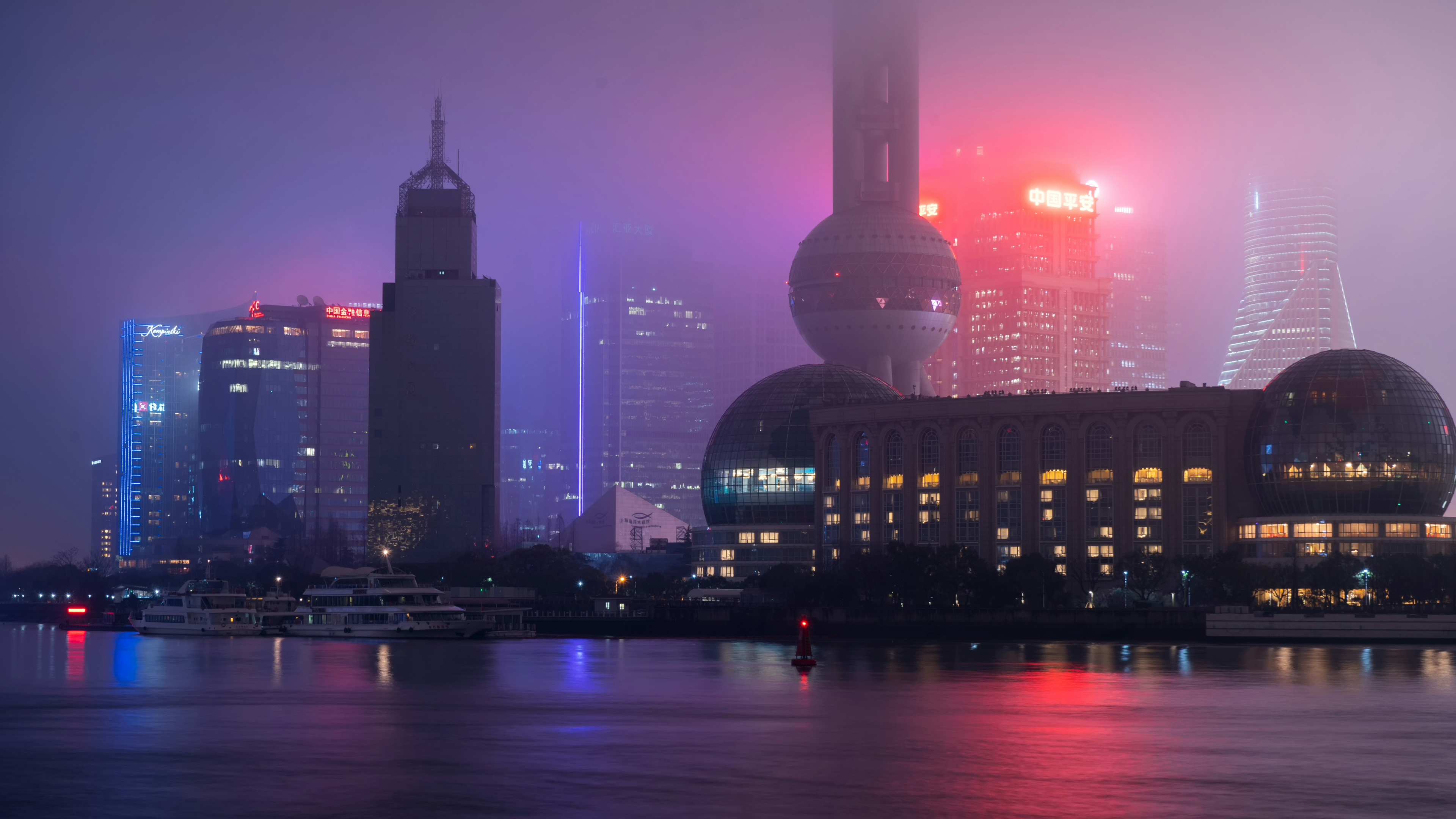 landscape city architecture apartment boat ferry trees fog lights night skyline skyscraper city neon lights 4K wallpaper