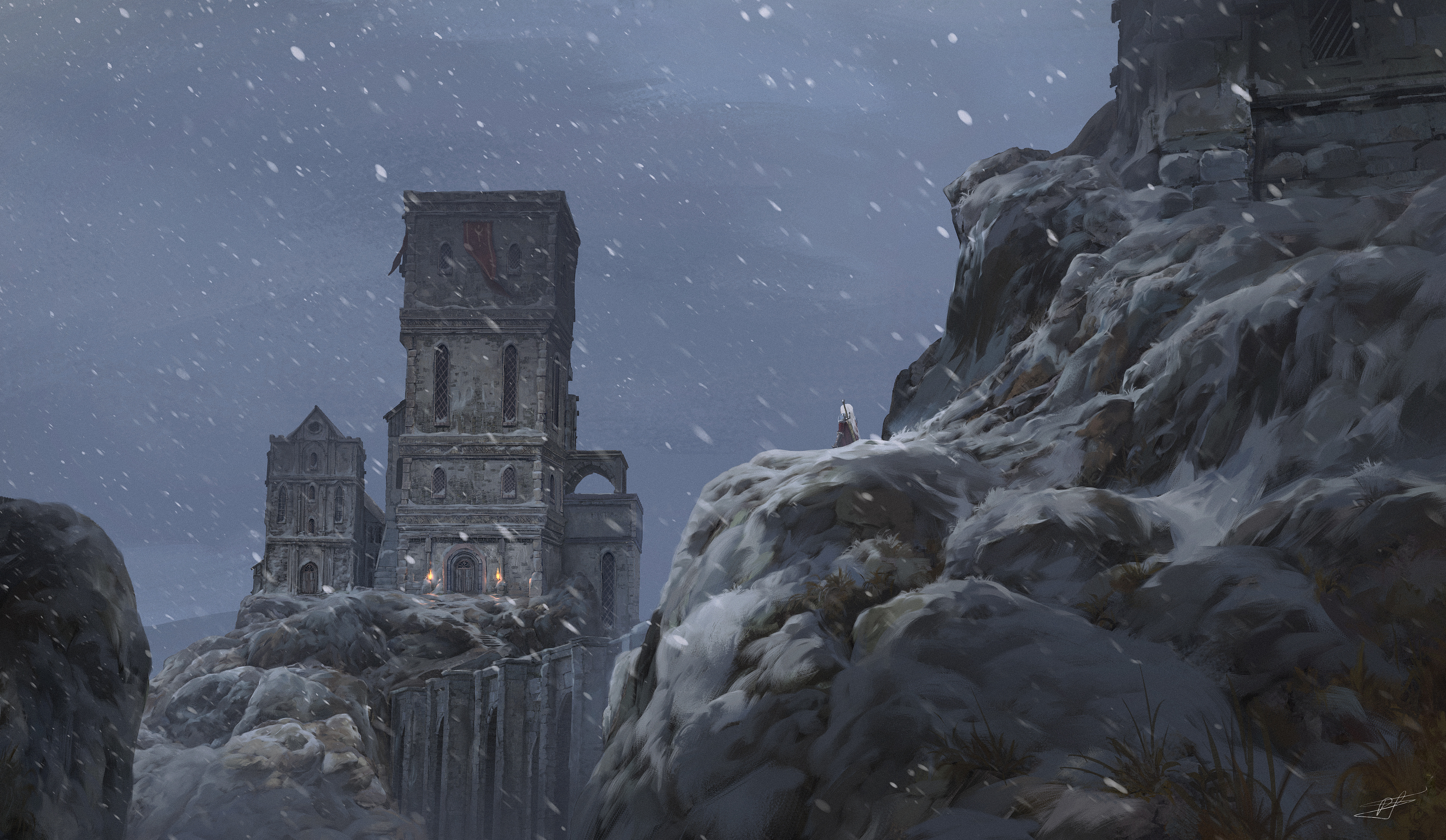 man digital art digital painting landscape environment snowing rock architecture castle winter 4K wallpaper