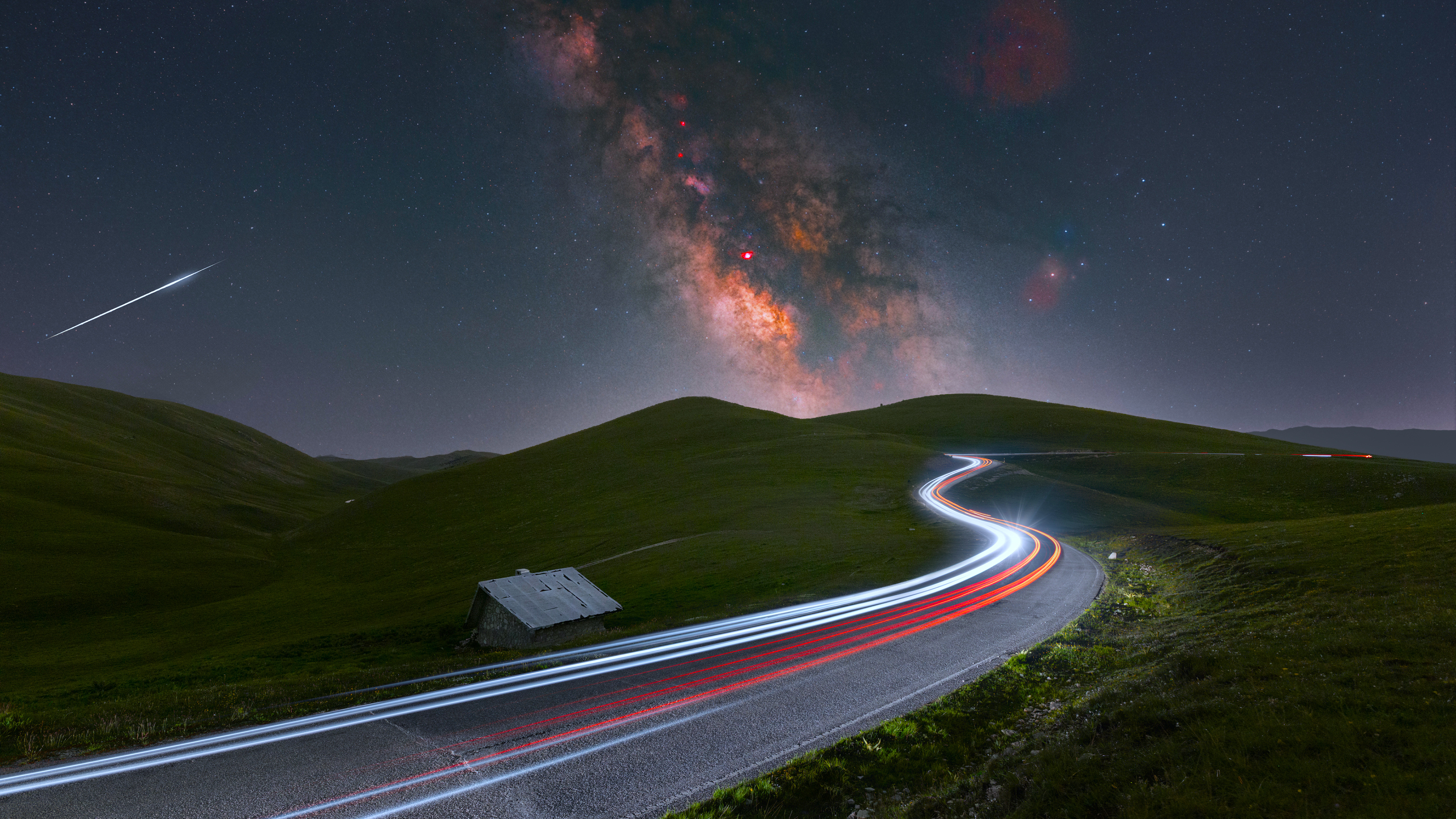 nature landscape grass road asphalt light rock stars night house hill galaxy 4K wallpaper