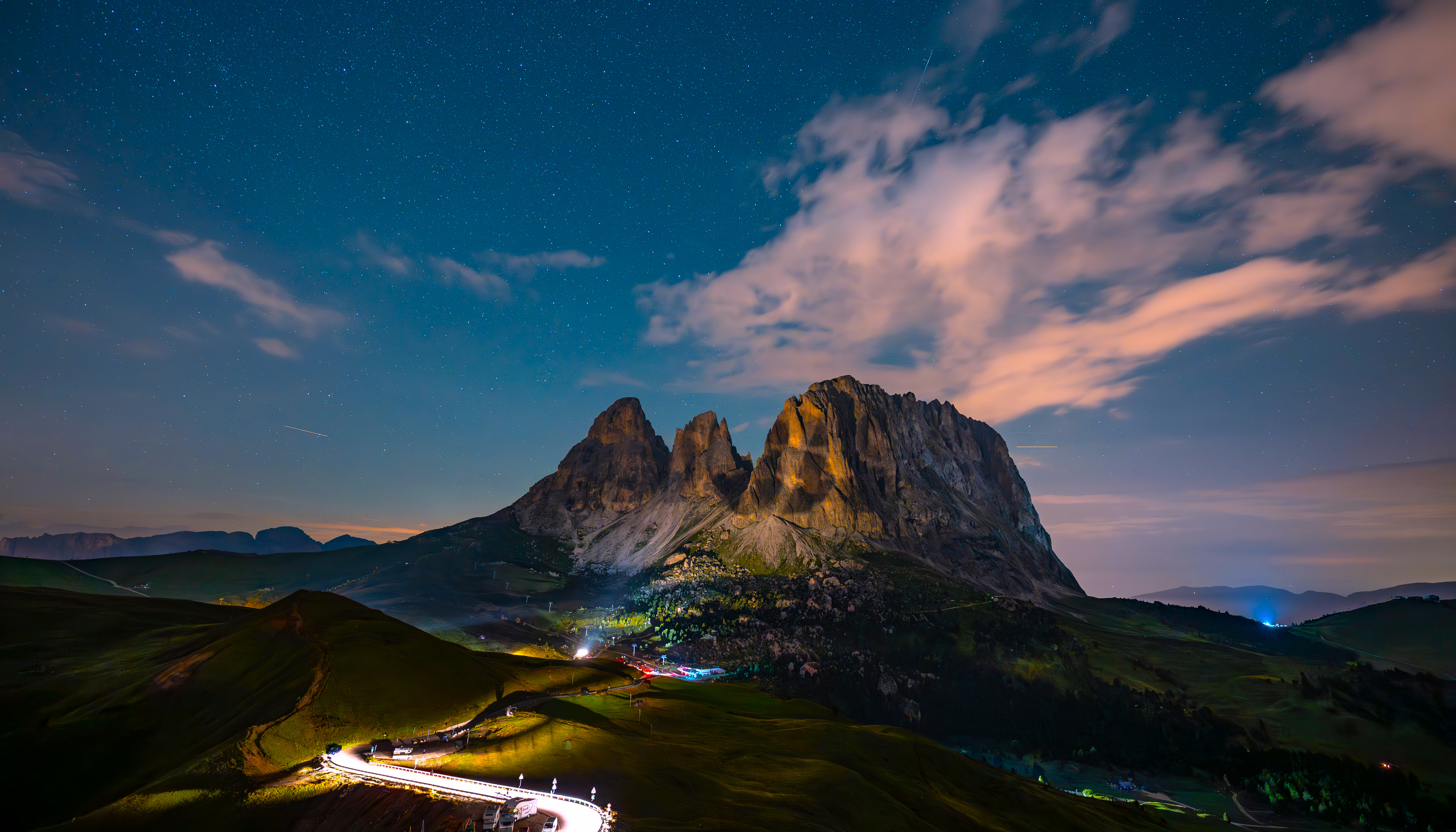 - nature landscape sky cloud mountain range light stars rock grass trees hill road night 4K wallpaper