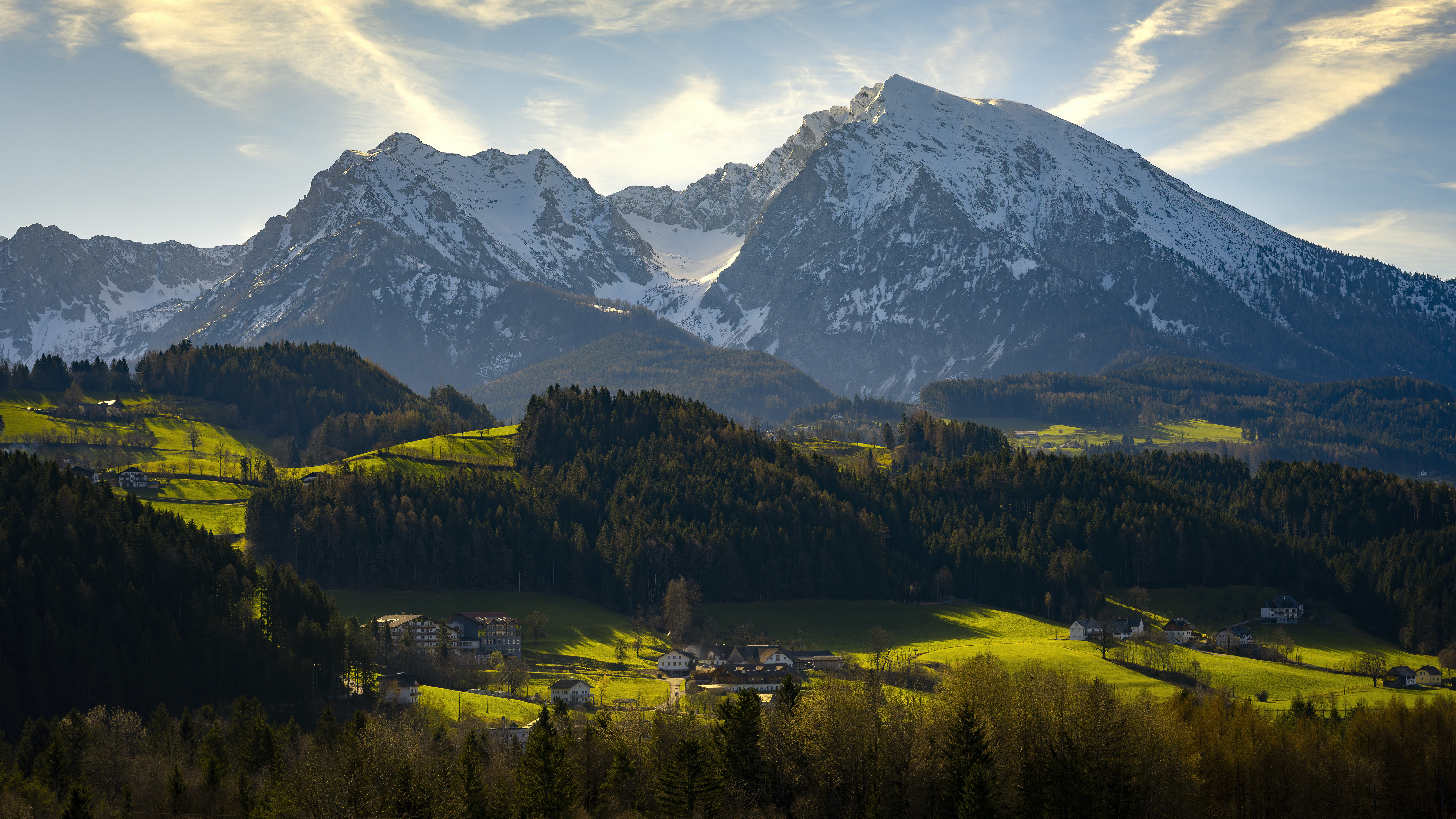 nature landscape trees forest sky clouds sunshine houses buildings mountains snow grass hills village 4K wallpaper