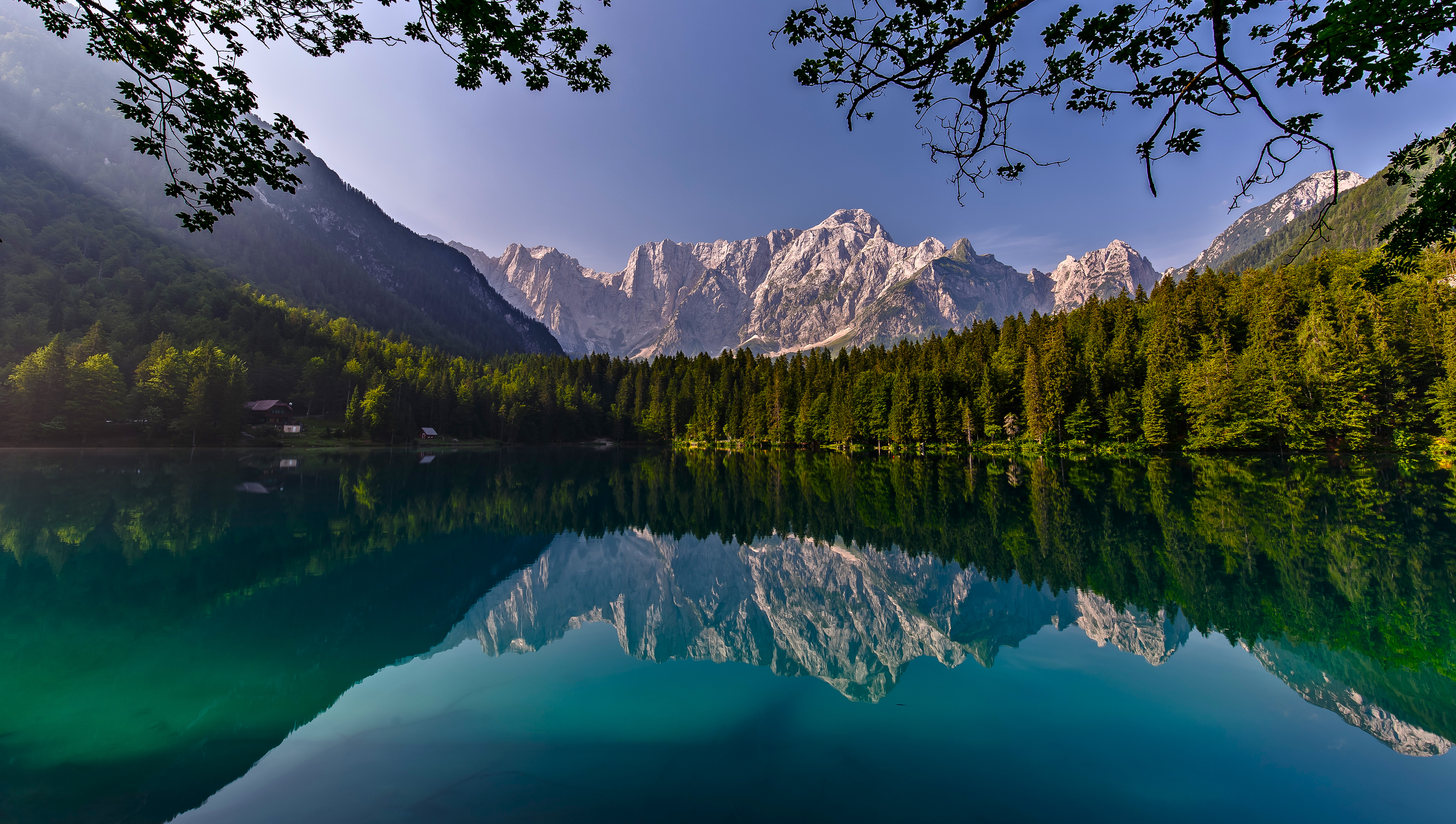 nature landscape trees forest water reflection clear sky lake mountains houses sunshine sky branches 4K wallpaper