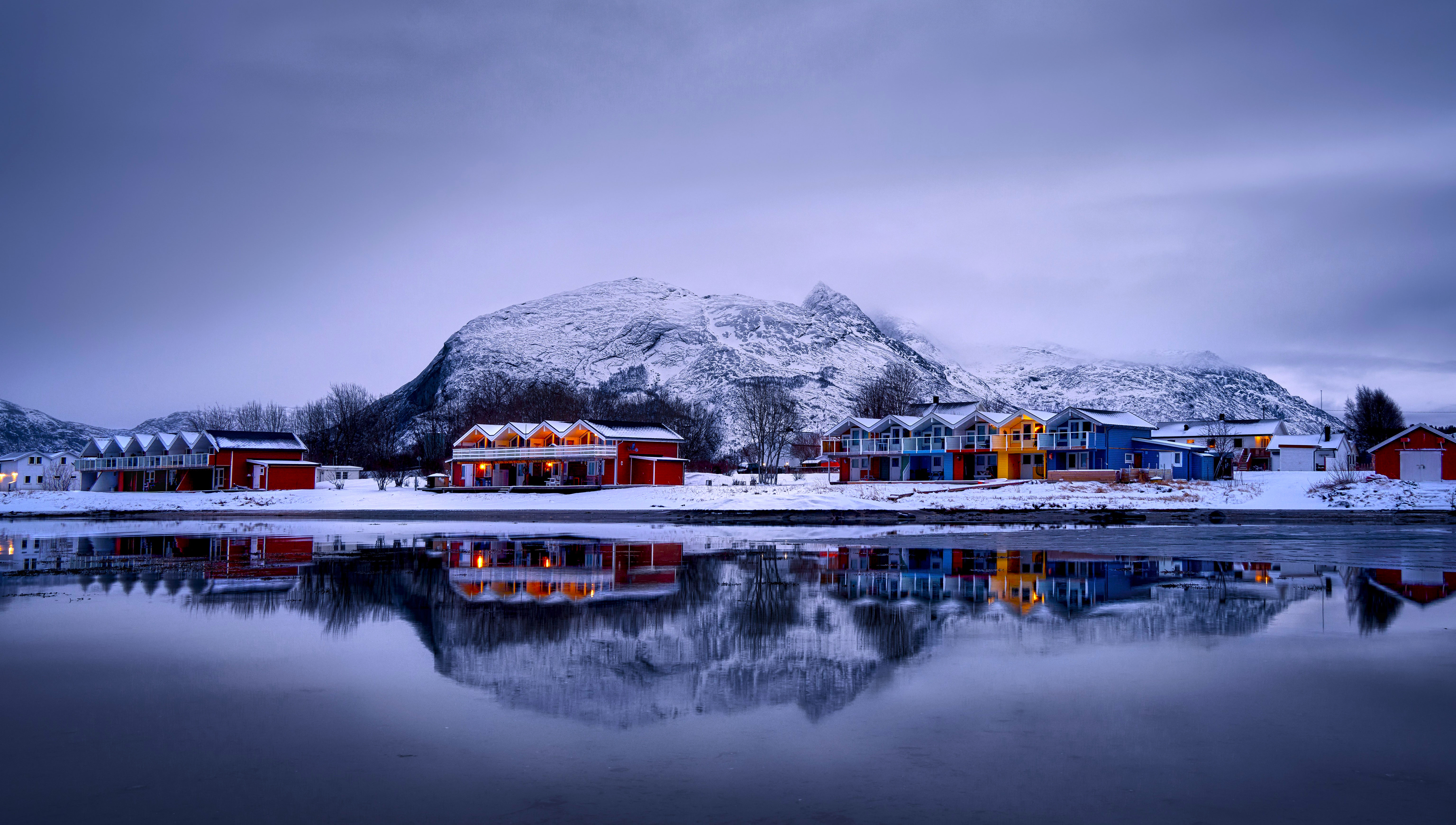 - Home > Landscape Wallpaper >Free download nature landscape water trees cloud house village reflection snow winter sky 4K wallpaper