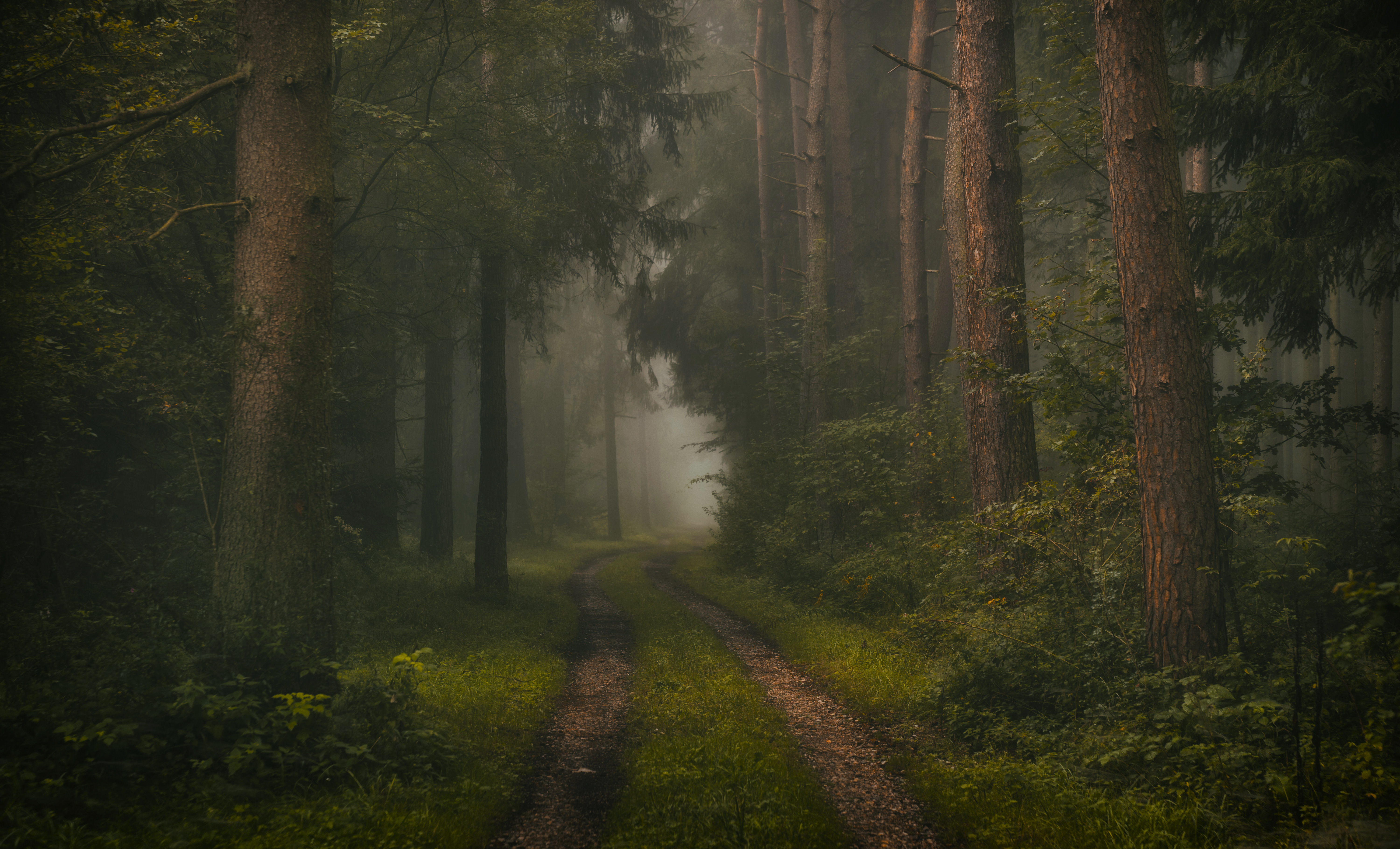 nature trees forest plants leaves leaves dirt road path grass moss fog 4K wallpaper