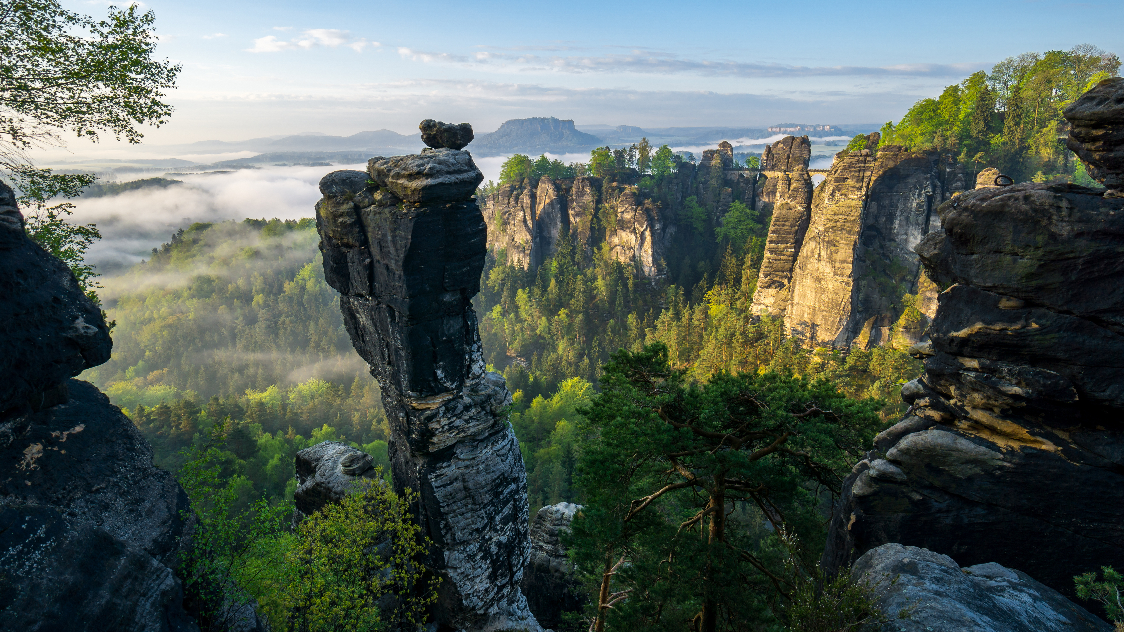 rocks forest nature trees park mist sky clouds 4K wallpaper