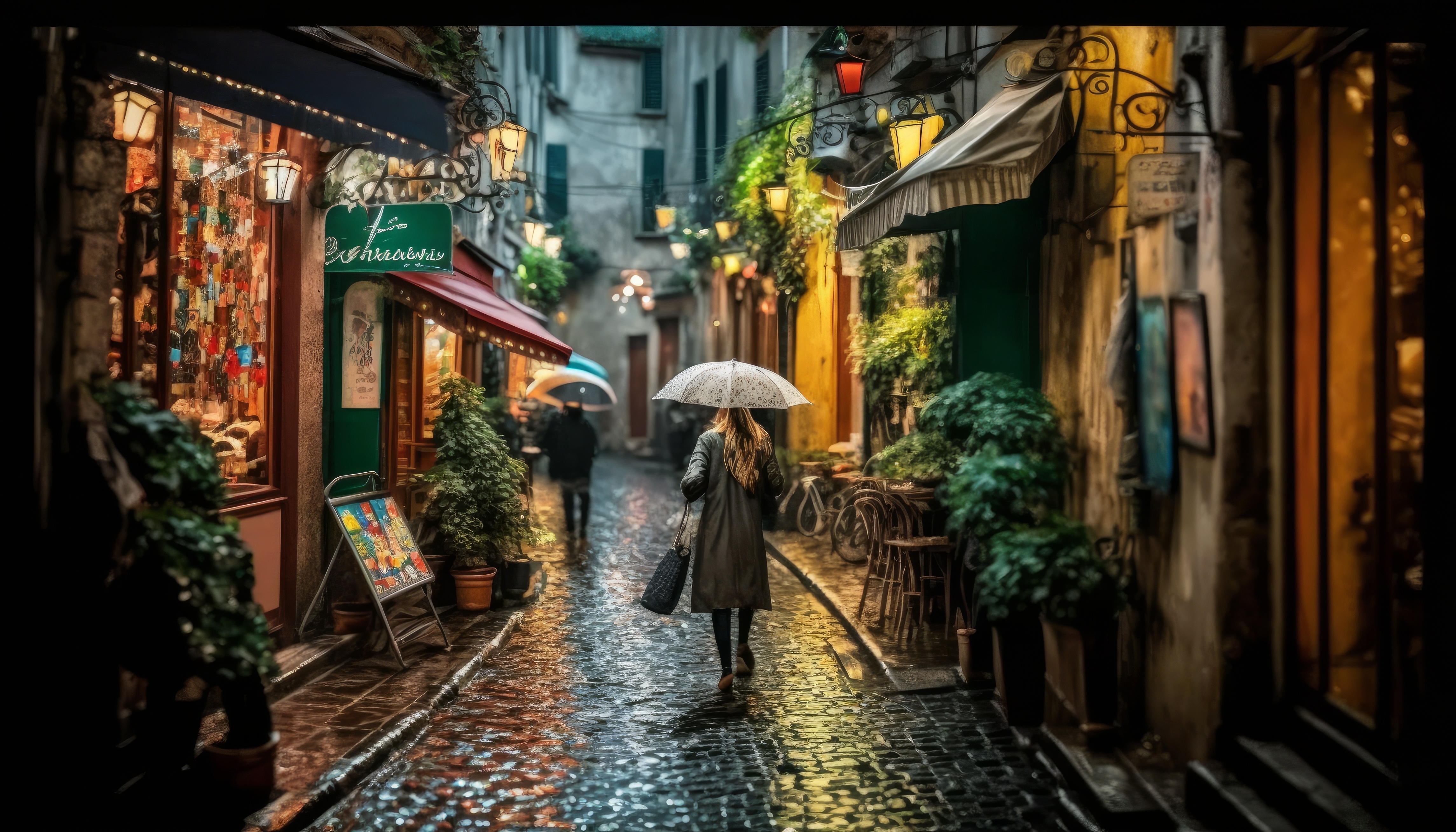 woman alley ai art illustration paris umbrella cobblestone alley plant street lamp computer wallpaper 4K wallpaper